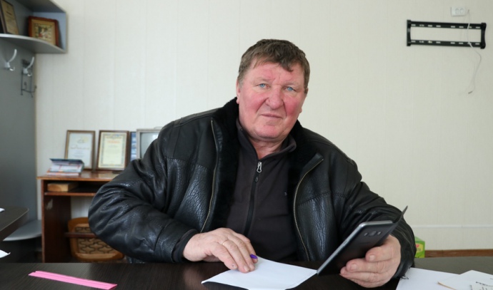 С бывшим владельцем предприятия Николаем Трибиненко автор говорит в административном здании хозяйства. После визита рейдеров на стенах остались следы от пуль, на окнах — элементы «баррикад». Из соседнего кабинета слышен шум рации охранника, без которого Трибиненко теперь по селу не передвигается.