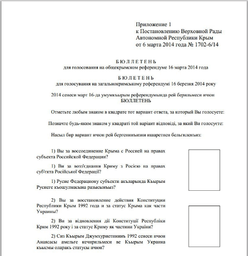 Если бы на «референдуме» большинство избрало второй вариант, то созданное РФ новое сателлитное правительство в Симферополе могло бы само выбирать между двумя разными версиями конституции Республики Крым 1992-го года. Ставленники Москвы, а не население Крыма, тогда смогли бы решить, какой именно текст основного закона Крыма им больше подходит. Возникает подозрение, что этот странный вопрос – вместо более обычной опции в таких голосованиях о простом сохранении статуса-кво – был целенаправленно нечётко сформулирован. Возможно, такая непонятная альтернатива поддержке аннексии должна была привести к увеличению вероятности выбора первого более понятного варианта – присоединения к РФ. Выбор, который стоял в марте 2014-го года перед жителями Крыма, в определённой степени был выбором не столько между Россией и Украиной, сколько между понятным и непонятным будущим.