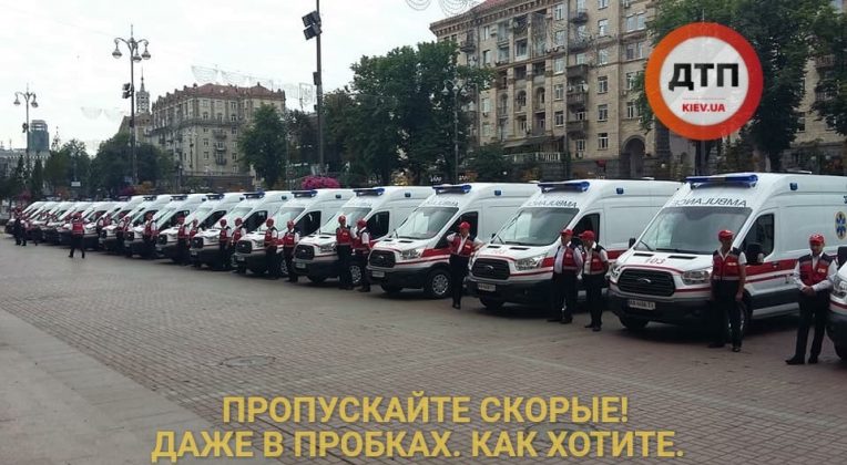 Как рассказали водители новых автомобилей, они съехались под здание КГГА для презентации новой техники. 25 машин будут переданы городу и разъедутся по разным столичным станциям медиков.