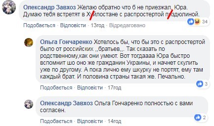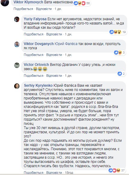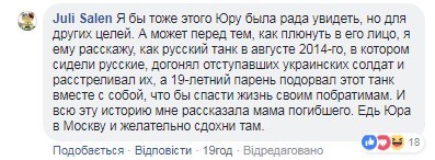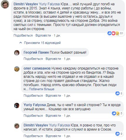 "Юра... мой лучший друг погиб на фронте в 2015. Знал четыре языка, имел суперработы (до войны, кстати, в Москве), оставил 4 детей и красавицу-жену... И все это не ради политиков, а за страну, справедливость на стороне Добра. Это война светлых сил с темными. Просто тут каждый должен определиться, на чьей он стороне", - обратился к Фалесе его знакомый Dimitri Vasylev.