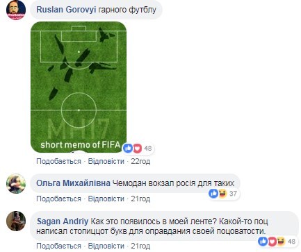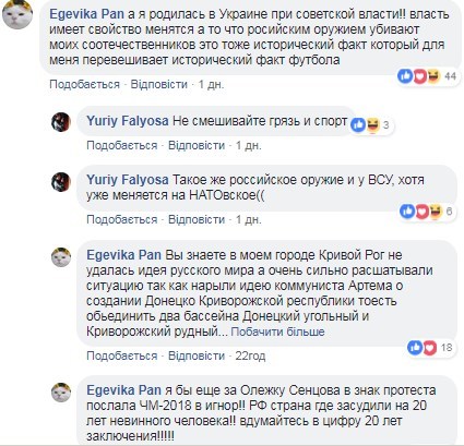 "Я родилась в Украине при советской власти! То, что росийским оружием убивают моих соотечественников, тоже исторический факт, который для меня перевешивает исторический факт футбола", - написала пользователь Egevika Pan.