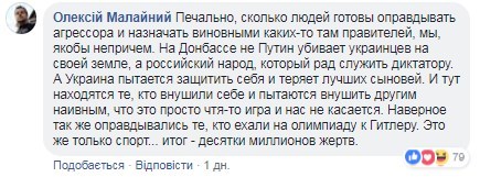 "На Донбассе не Путин убивает украинцев на своей земле, а российский народ, который рад служить диктатору. А Украина пытается защитить себя и теряет лучших сыновей. И тут находятся те, кто внушили себе и пытаются внушить другим наивным, что это просто чья-то игра и нас не касается. Наверное, так же оправдывались те, кто ехали на олимпиаду к Гитлеру. Это же только спорт... Итог - десятки миллионов жертв", - добавил Олексій Малайний.