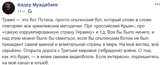«Трамп — это бот Путина, просто ольгинский бот, который слово в слово повторяет все кремлевские методички. Про «российский Крым», про «самую коррумпированную страну Украину»» и т.д. Все бы было ничего, и над этим можно было бы смеяться, если бы ольгинским ботом не был президент самой важной и влиятельной страны в мире. На мой взгляд, всё серьёзно. Открыта дорога к Третьей мировой (гибридной) войне».