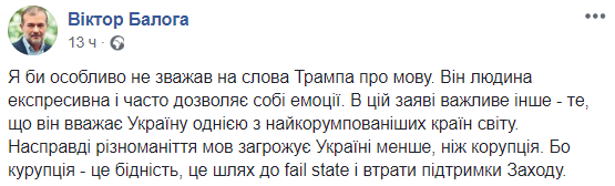 «Я бы особо не обращал внимания на слова Трампа о языке. Он человек экспрессивный и часто позволяет себе эмоции. В заявлении важно другое — то, что он считает Украину одной из самых коррумпированных стран мира. На самом деле разнообразие языков грозит Украине меньше, чем коррупция. Потому коррупция — это бедность, это путь к fail state и потере поддержки Запада».