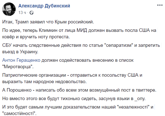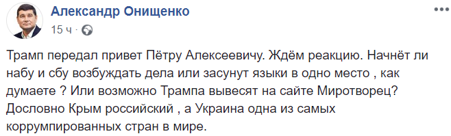 «Трамп передал привет Пётру Алексеевичу. Ждём реакцию. Начнёт ли набу и сбу возбуждать дела или засунут языки в одно место , как думаете ? Или возможно Трампа вывесят на сайте Миротворец? Дословно Крым российский , а Украина одна из самых коррумпированных стран в мире».