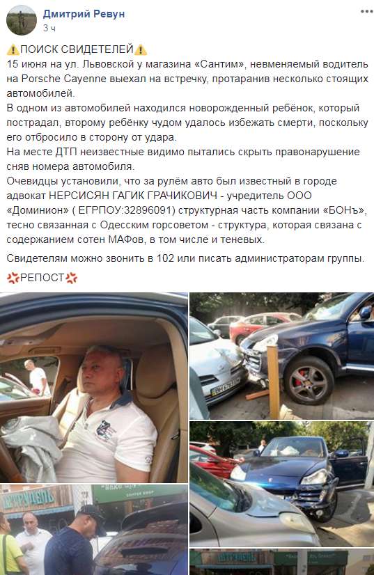 Также, очевидцы установили, что за рулем был Нергисян, который является учредителем ООО "Доминион" - структурная часть компании "БОНъ", тесно связанная с Одесским горсоветом. Эта структура связана с содержанием сотен МАФов.
