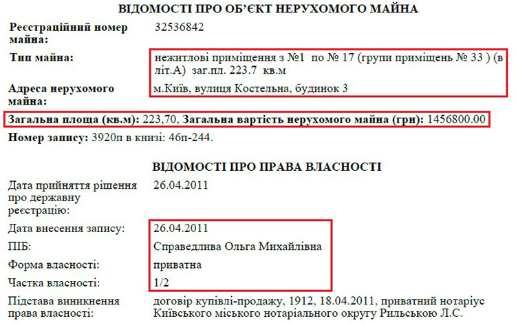 Ольга Михайловна с 2011 года была владелицей нежилых помещений по адресу: ул. Костельная, 3, что в самом центре Киева. Площадь этих помещений - 223 кв. м. Но уже в 2015 году их владельцем становится отец прокурора. Получается, что по состоянию на 2014 год именно Ольга была владельцем данного имущества, однако в декларации прокурора оно не указано!