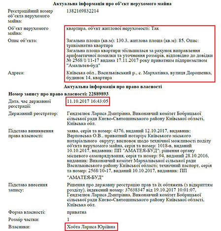 Теща прокурора тоже имеет значительное количество недвижимости. В частности, в ее собственности трехкомнатная квартира в селе Мархалевка, что подле Киева, и два земельных участка в этом же населенном пункте; жилой дом в Николаеве площадью почти 230 кв. м., столичная квартира на 79 кв. м. по адресу: ул. Васильковская 15/14.