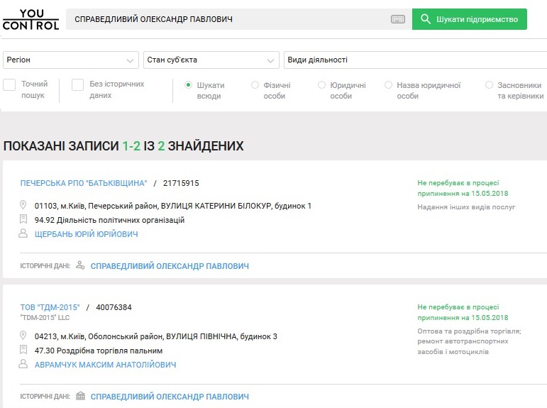 В одном из своих интервью Дмитрий Справедливый утверждал, что его отец работал в органах МВД. Речь идет об Александре Павловиче Справедливом. В СМИ отмечают, что Александр Павлович в 2001 году был руководителем Печерского районного управления УМВД в городе Киеве. В 2002-2003 годах он руководил милицией в Волынской области, где, по информации журналистов, отличился незаконной приватизацией квартиры. Также человек с такими же ФИО значится помощником нардепа Юрия Одарченко, а также кандидатом в Киевсовет от ВО «Батькивщина». С помощью аналитической системы YouControl мы также обнаружили, что в период 2012-2017 годов Александр Павлович возглавлял Печерское отделение партии «Батькивщина» и был среди соучредителей ООО «ТДМ-2015».
