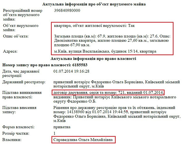 Еще одна квартира, владельцем которой является Ольга Справедливая, расположена в Киеве по адресу: ул. Васильковская 15/14. Это жилье Ольга получила на основании договора дарения от своей матери.