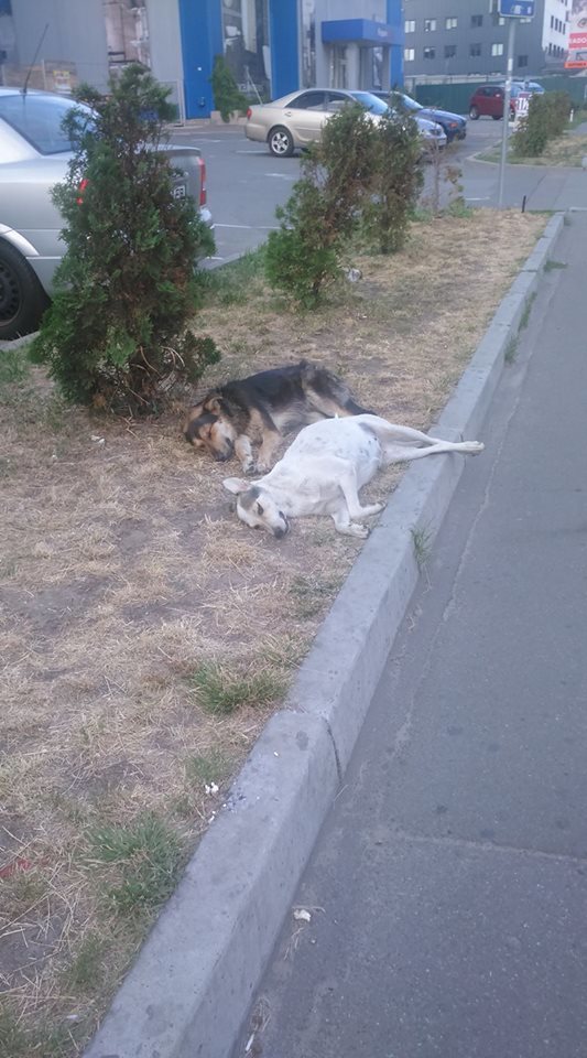В сети появились фото двух собак, одна из которых охраняла другую, которая, вероятно погибла под колесами автомобиля возле заправки "Амис" в районе станции метро "Почайна" в Киеве.