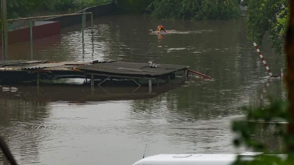 Рівень води піднявся до покрівлі будинків та гаражів, автомобілі, що стояли ззовні, також повністю затоплені. Люди плавають на човнах, або ж пересуваються по шию у воді.