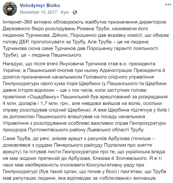 Роман Труба прокурор зі стажем. Як ніяк носить погони 20 років. В 2013 році він вже працював прокурором Пустомитівського району Львівської області. А вже після майдану, перейшов в ГПУ. Коли Генпрокурором був Махніцький, Труба працював головою управління з розслідування особливо важливих справ. А щойно туди прийшов Ярема – Трубу призначили заступником керівника Головного слідчого управління ГПУ. З 2015 року пішов працювати у приватну правозахисну компанію. Маю інформацію, що саме нардеп Сергій Пашинський виступив лобістом в призначенні Труби директором ДБР. Порошенко бачив головою Олексія Геращенкова, але після скандалу в НАЗК, потрібна була інша кандидатура. І близький соратник Пашинського, глава РНБО Турчинов дав рекомендації Порошенку, що Труба людина надійна.