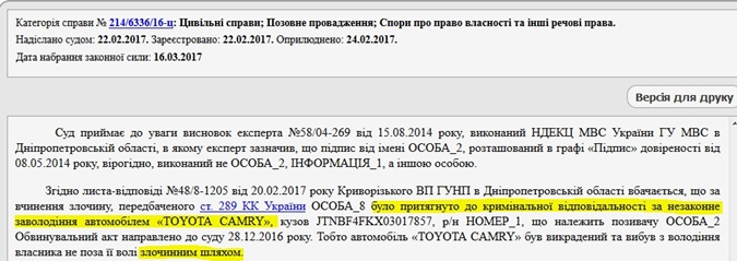 В результате исполнения судебного решения эту машину у Денеги забрали и возвратили в собственность лица, имевшего на этот автомобиль законное право. Соответственно, и в декларации прокурора ГПУ авто "испарилось".