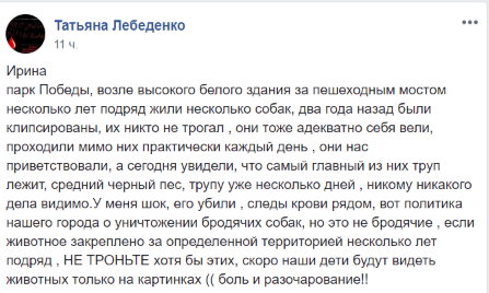 "Парк Победы, возле высокого белого здания за пешеходным мостом несколько лет подряд жили несколько собак, два года назад были клипсированы, их никто не трогал, они тоже адекватно себя вели, проходили мимо них практически каждый день, они нас приветствовали, а сегодня увидели, что самый главный из них труп лежит, средний черный пес, трупу уже несколько дней, никому никакого дела видимо. У меня шок, его убили , следы крови рядом, вот политика нашего города о уничтожении бродячих собак, но это не бродячие, если животное закреплено за определенной территорией несколько лет подряд, НЕ ТРОНЬТЕ хотя бы этих, скоро наши дети будут видеть животных только на картинках. Боль и разочарование!" - написала жительница города Ирина на странице общественной организации "Шарон" в Facebook.