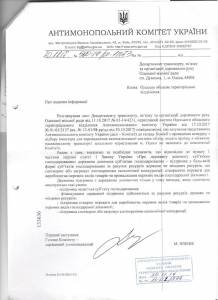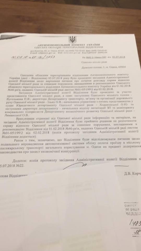Уже в феврале следующего года после многочисленных публикаций СМИ, Одесское отделение АМКУ «проснулось» и усмотрело нарушения в проведении конкурсного отбора в части экономической конкуренции. Речь идет об обязательном наличии сервисного центра для участников конкурса, что снизило количество претендентов до одного. Чиновники направили в мэрию соответствующее письмо с рекомендацией провести его повторно. Их обязывали в течение трех месяцев устранить нарушения.