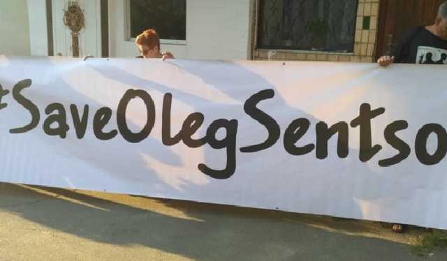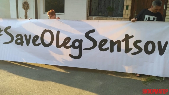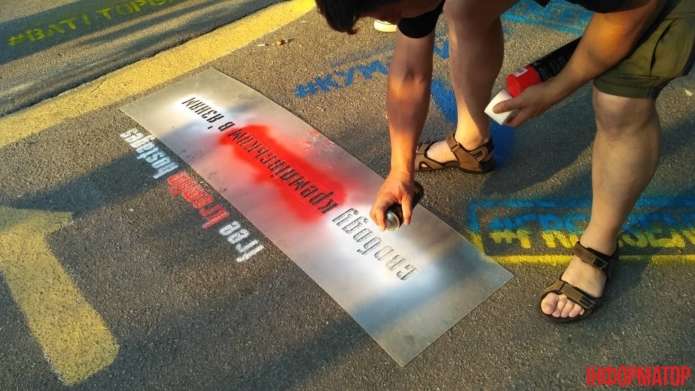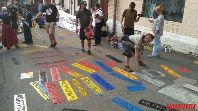 Активісти розмалювали асфальт під будівлею трафаретним графіті із закликом звільнити українського політв’язня Олега Сенцова.
