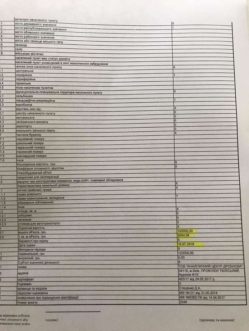 2. Субъект оценочной деятельности ООО «Аналитический центр "Дробнова"» внес в ЕБ информацию по отчету про стоимость нежилой квартиры площадью 44 кв. м. в Киеве по ул. Академика Грекова по цене квадратного метра 2684 грн. Фактическая цена квартиры, при рыночной цене 600-700 долларов за квадратный метр, была занижена в 6-7 раз, отчего было недоплачено налогов более чем на 50 тыс. грн.