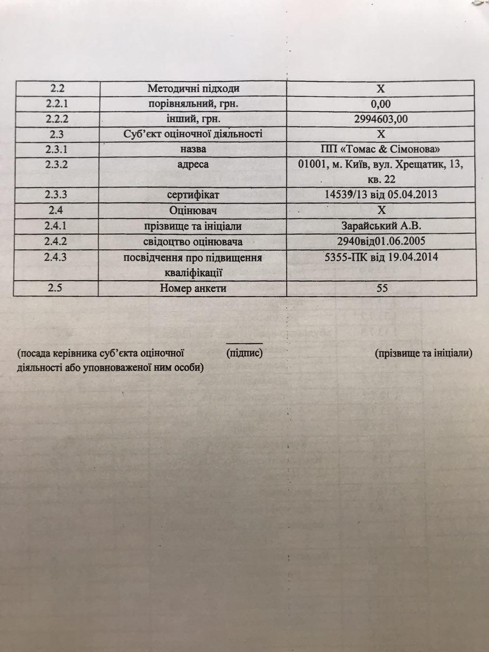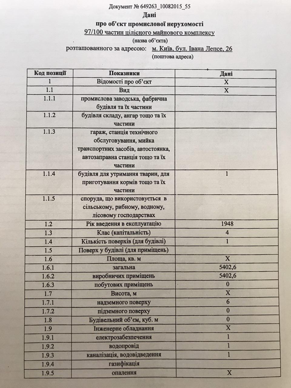 1. Оценочная компания ЧП «Томас и Симонова» внесла в единую базу информацию из отчета по оценке киевского объекта промышленной недвижимости по адресу бульвар Ивана Лепсе, 26 площадью 5 402 кв. м. Общая оценочная стоимость составила 2 994 603 грн, то есть чуть более чем 550 грн за кв. м. Цена недвижимости была занижена более чем в три раза, отчего бюджет недополучил более 500 тыс. грн.