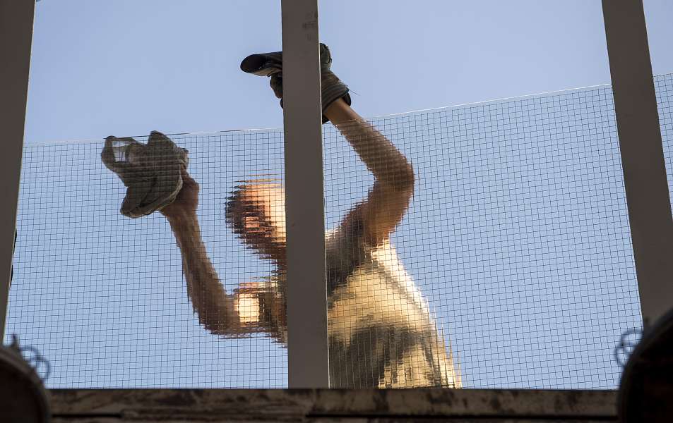 Работам мешает жара, так как металлические конструкции разогреты до 50 градусов. Также среди сложностей - большое количество ручной работы, сложная прирезка стекла, режимный характер объекта.