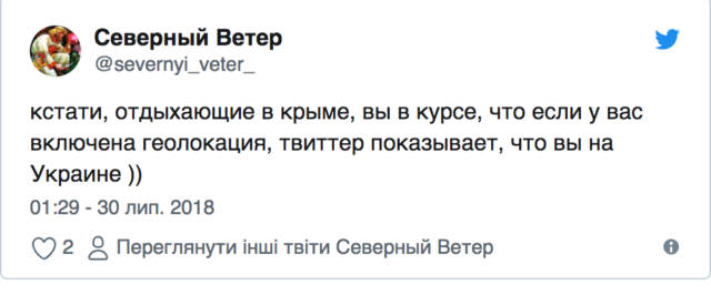«Кстати, отдыхающие в Крыме, вы в курсе, что если у вас включена геолокация, Twitter показывает, что вы в Украине?» — отметил пользователь с ником «Северный ветер».