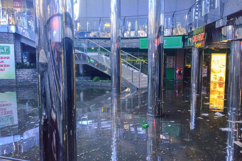 В ночь на четверг, 16 августа, на Киев обрушилась гроза с порывами ветра и градом. Улицу Крещатик полностью затопило, а затем вода хлынула в торговый центр «Метроград».