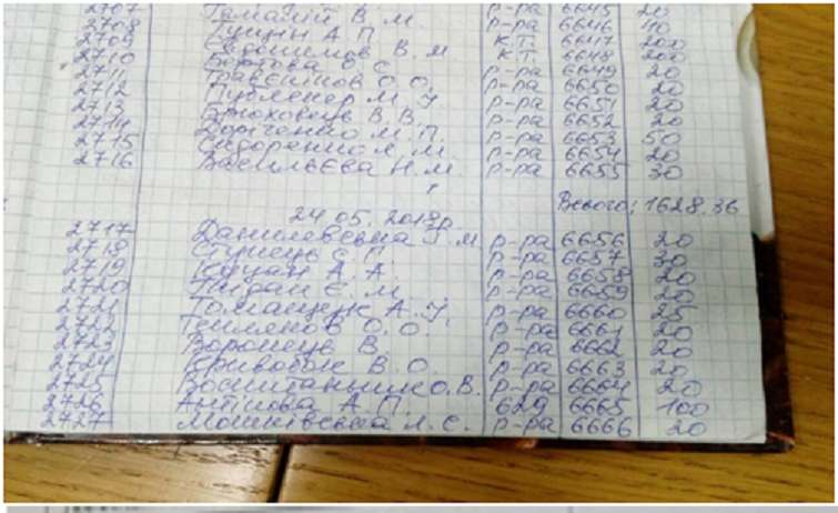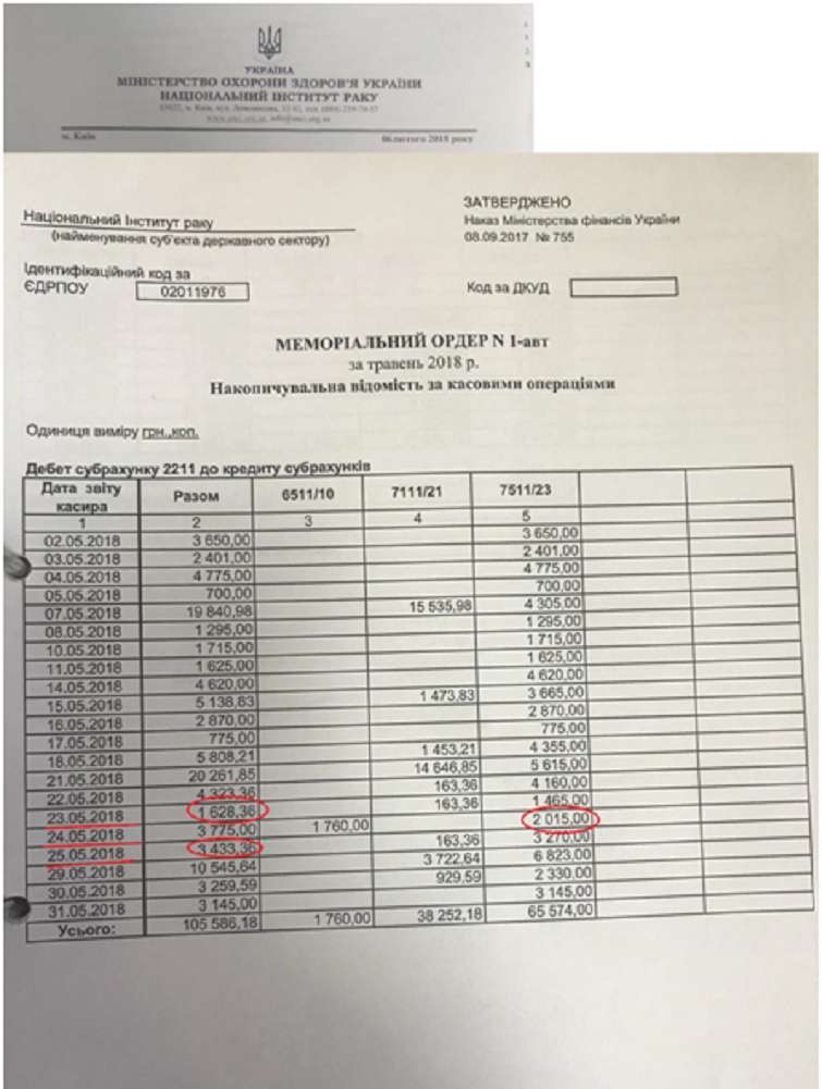Каждая сумма за май подтверждается не только "черной кассой" - тетрадью в клеточку - но и официальными переводами Института рака на свой казначейский счет. 1648 гривен за 23 мая 2015 гривен за 24 мая.