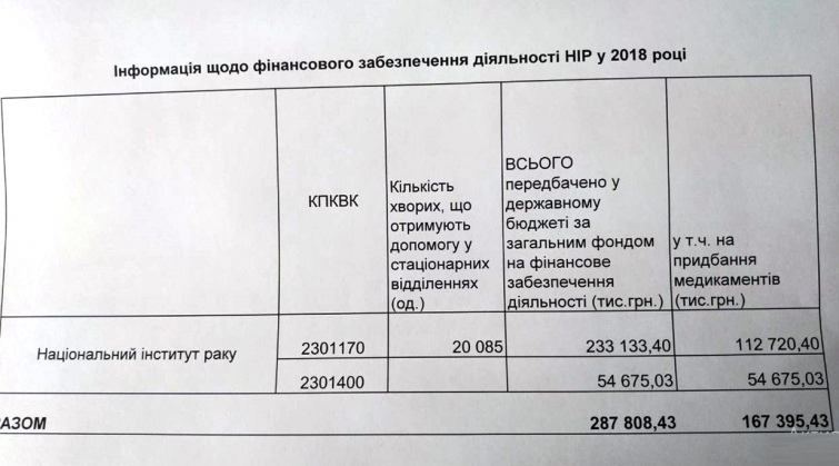 Бюджет Института рака - 287 миллионов гривен в год. Из них на закупку лекарств - 168 миллионов на 2018 год.