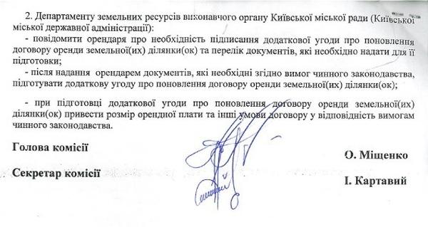 В результате ответственность за автоматическое обновление договоров аренды с конкретных должностных лиц КГГА переместилось на земкомиссию. Все дополнительные соглашения о возобновлении, которые подписывает мэр Виталий Кличко, ссылаются именно на Вывод и выписку из протокола Комиссии, как на основание обновления.