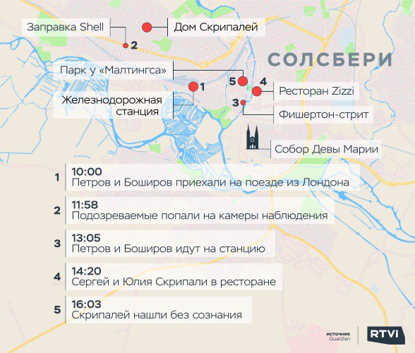 В то же время издание RTVI составило карту с местами, где были Петров и Боширов в день отравления Скрипалей.