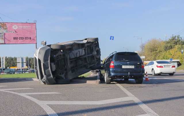 В Киеве на Окружной дороге, недалеко от улицы Янтарной, произошла авария. Микроавтобус Mercedes Sprinter столкнулся с Opel Astra, перевернулся и застрял в отбойнике.