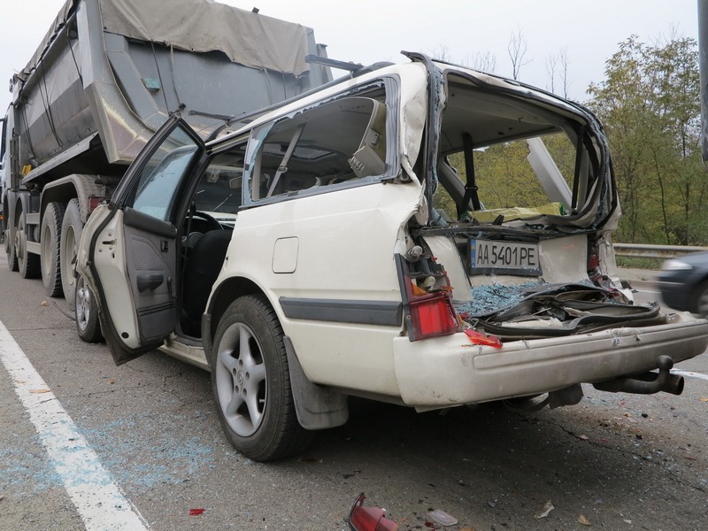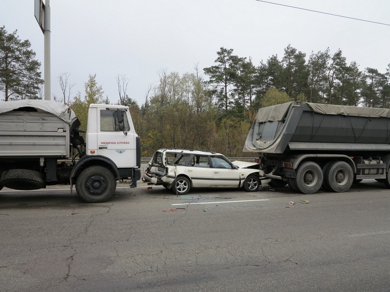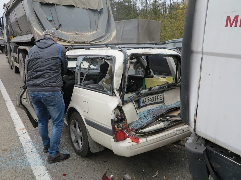 Корреспонденту «ФАКТОВ» удалось выяснить, что недалеко от Минского шоссе на спуск, в сторону Дымера, выстроилась колонна машин. За тяжелым Mercedes заняла место старенькая Mazda. Но загородную поездку отменил водитель груженого МАЗа. Он врезался в легковушку, подвинул ее вперед, но дальнейшее продвижение остановил стоящий впереди грузовик…