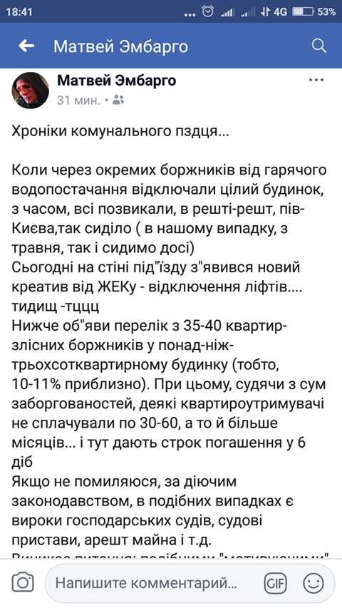 В Киеве сотрудники ЖЭКа развесили предупреждения на домах об отключении лифтов и электричествам из-за долга отдельных жителей. Об этом в Facebook сообщает Матвей Эмбарго.