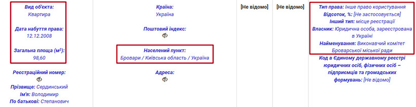 Володимир Сердинський після розлучення також декларує нежитлові приміщення своєї колишньої дружини, що розміщені в Броварах, а їхня площа 10 кв. м.