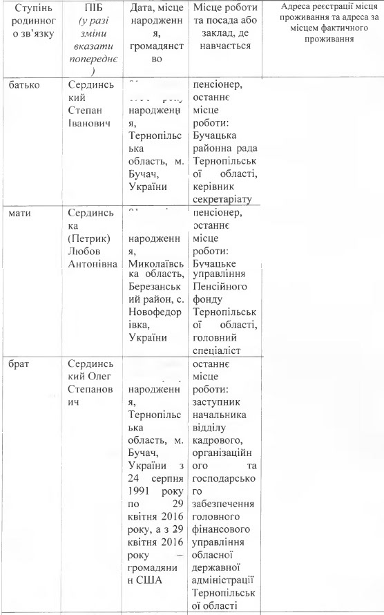 Колишня дружина судді нині працює консультантом у Касаційному кримінальному суді у складі Верховного Суду та подала відповідну електронну декларацію. Нас зацікавило, що з 2013 року Наталія Володимирівна користується квартирою невідомої особи, площею 39 кв. м. Однак у жодній декларації Володимира Сердинського за 2014-2016 роки це житло не згадане. Також відомо, що в період 2007-2014 років Наталія Володимирівна була зареєстрована фізичною особою-підприємцем.