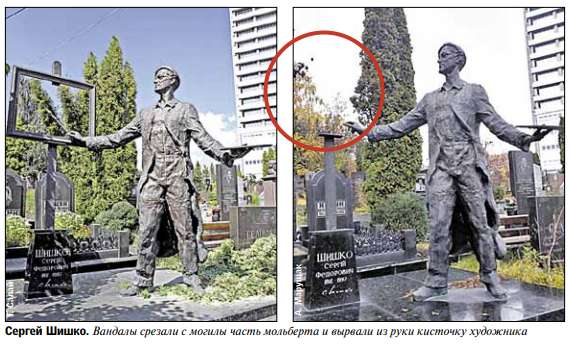 Его памятник представлял собой фигуру художника, который держит в руках палитру и кисточку, рисуя картину на мольберте. Вандалы отпилили кисточку и мольберт. “Будем решать вопрос с восстановлением поврежденных памятников и заниматься наведением порядка с охраной могил на Байковом кладбище. Также – более тщательно –проверять пункты приема цветных металлов”, – обещают в мэрии. А в полиции Киева нам сообщили, что грабитель памятника Леси Украинки задержан. “Дело направлено в суд. С начала года по воровству памятников на Байковом кладбище было открыто пять уголовных производств.Подобное правонарушение карается штрафом в 3,4 тысячи гривен или лишением свободы до трех лет”, – рассказали правоохранители.