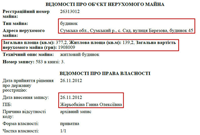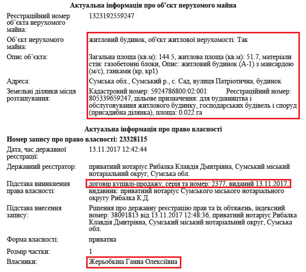 Проживає прокурор разом із дружиною у будинку площею 377 кв. м. Розташований він у селищі Сад, що неподалік Сум. Власником цього житла значиться матір прокурора Ганна Олексіївна Жерьобкіна, а задекларована його вартість – 1,9 млн грн.