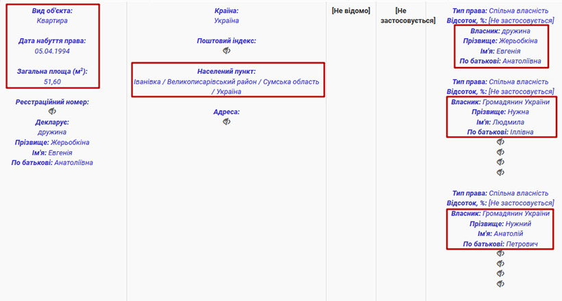 Також Євгенія Анатоліївна Жерьобкіна має у спільній власності з своїми батьками квартиру у смт. Іванівка. Площа цього житла 51 кв. м. Право власності отримано суддею ще у 1994 році. Однак у своїх деклараціях за 2012-2014 роки вона знову забуває вказувати це житло.