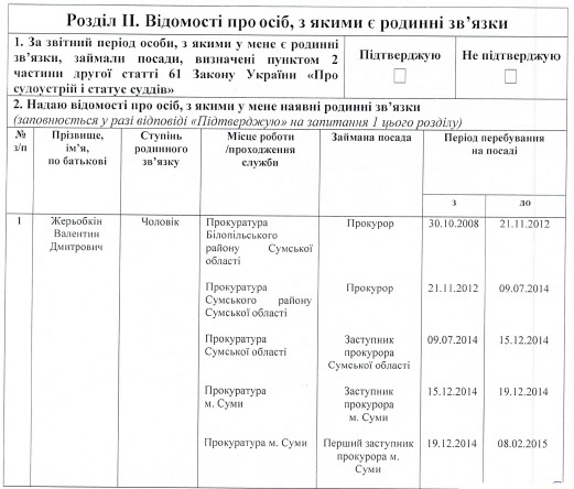 Схожа ситуація була із квартирою самого прокурора. Валентин Дмитрович Жерьобкін у своїй декларації за 2015 рік вказував, що користується квартирою батька у Сумах з 2005 року. Однак в деклараціях за 2012 та 2013 роки це житло не згадане. Натомість в декларації за 2014 рік – вказане.За якою логікою це було зроблено – невідомо.