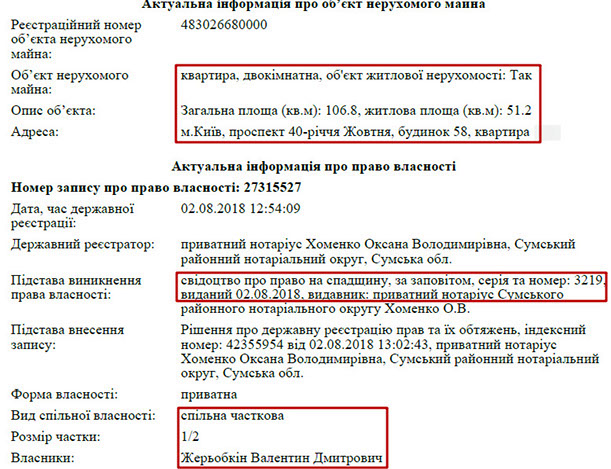 Однак близько місяця тому, після смерті батька, вищезгадане авто Mersedes-benz ML350 2013 року випуску Валентин Жерьобкін швидше за все отримав у спадок, адже саме він значиться сьогодні його власником. Це ж стосується і квартири в Києві площею 106 кв. м., за адресою: проспект 40-річчя Жовтня (зараз проспект Голосіївський), 58. Це багатоквартирний будинок, в якому подібне житло коштує щонайменше 5 млн грн. Цього рухомого та нерухомого майна ще немає в електронних деклараціях прокурора.