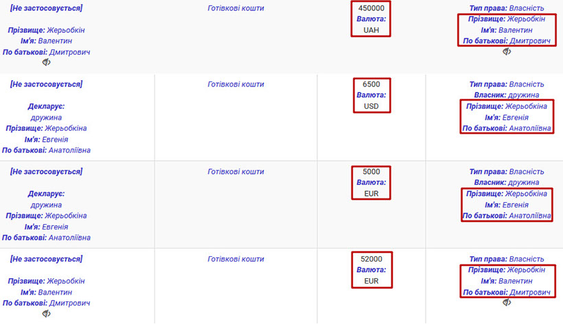 Отримуючи подарунки в 2,5 млн грн від батька, Валентин Жерьобкін, вочевидь, може дозволити собі багато заощаджувати. Зокрема у його власності 450 тис. грн та 52 тис. євро готівкою. У дружини Євгенії Анатоліївни – 6,5 тис. доларів та 5 тис. євро.