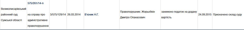 Цікаво, що Дмитро Панасович Жерьобкін був визнаний винним в скоєнні адміністративного правопорушення у 2014 році. У судовому рішенні йдеться, що Дмитро Панасович періодично занижував суми сплати податків на суму 430 тис. грн. У судовому засіданні вину Дмитро Жерьобкін свою визнав. І суд присудив йому штраф «в розмірі 85 гривень на користь держави»!