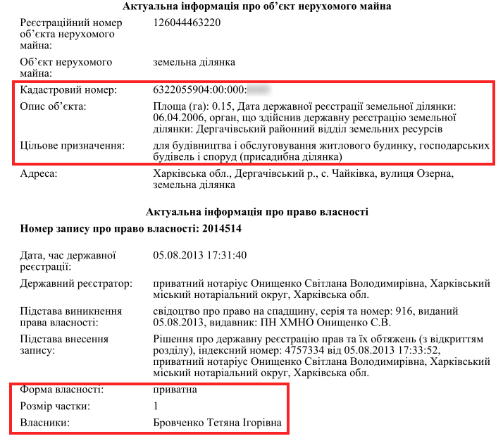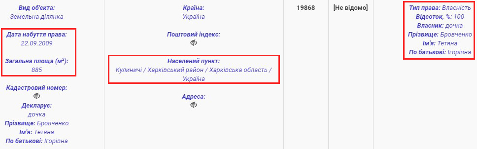 Донька Тетяна Бровченко володіє ділянкою 0,08 га та 0,15 га. Остання розміщена на лісосмузі з цільовим призначенням для будівництва і обслуговування житлового будинку.