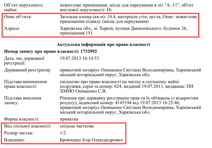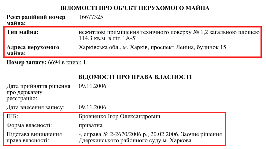 Також у власності Ігоря Олександровича перебуває приміщення технічного поверху на 114 кв. м у Харкові. І хоч право власності на нерухомість набуте ще у далекому 2006 році, у жодній з паперових декларацій його не було. До того ж приміщення набуте у власність на підставі рішення Дзержинського райсуду Харкова, попереднє місце роботи Бровченка.