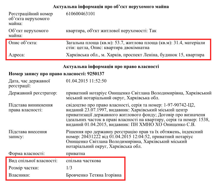 Донька Тетяна Бровченко мешкає у Харківській квартирі на 53 кв. м. Житло набуте на підставі свідоцтва Харківського міського центру приватизації службового фонду.