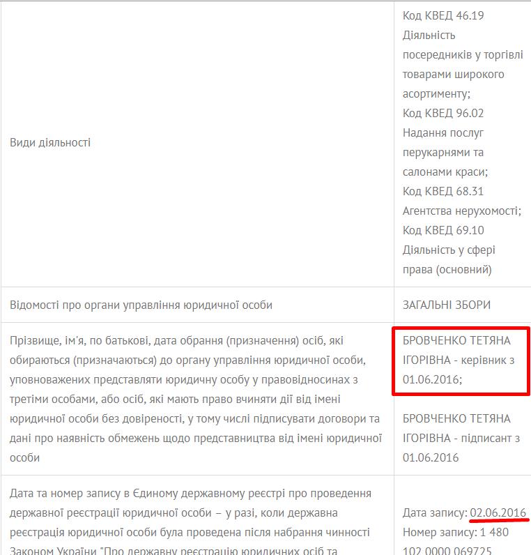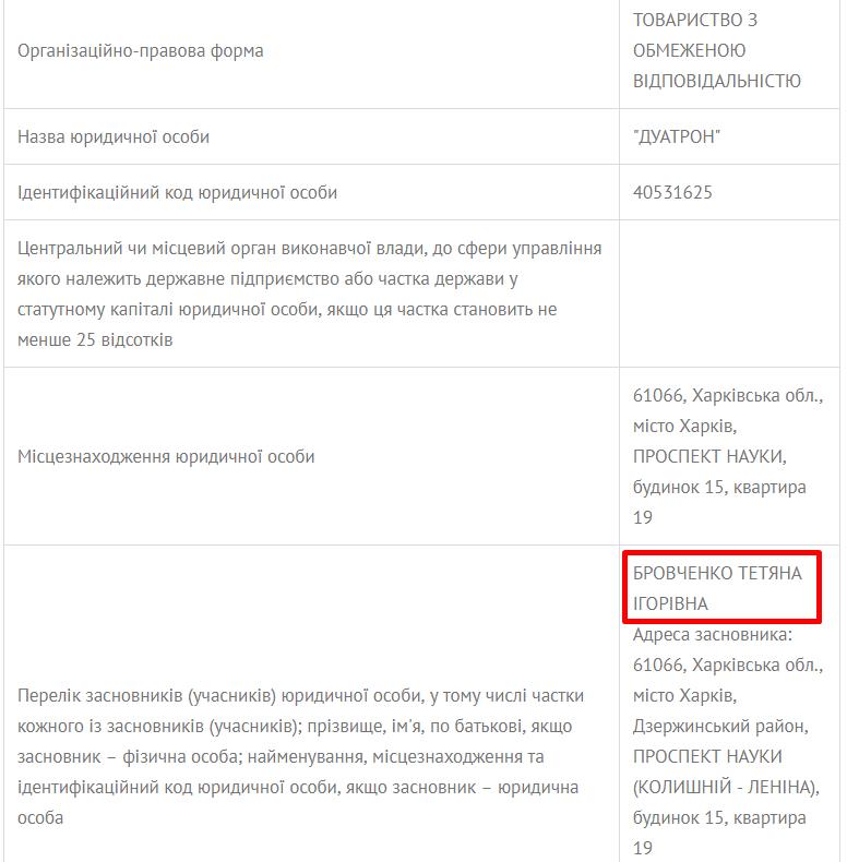 Ще однією цікавою нерухомістю дочка судді володіє через юридичну особу. Вона є єдиним засновником та керівником ТОВ «ДУАТРОН», яке створене у червні 2016 року та надає послуги у сфері права.