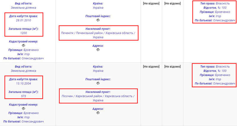 Ігор Бровченко є власником двох земельних ділянок у межах Харківського району (0,05 га та 0,12 га)