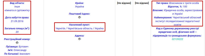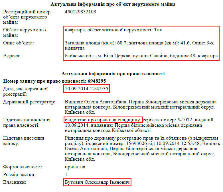 Через вісім місяців у тому ж 2014 році прокурор Олександр Бутович отримав у спадщину квартиру площею 68 кв. м. в Білій Церкві. Оскільки у 2016 році Олександр Бутович перебрався до Чернігова – він потребував там житла. Саме тому у тому ж році він отримує право користування кімнатою в гуртожитку площею 20 кв. м.