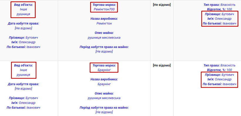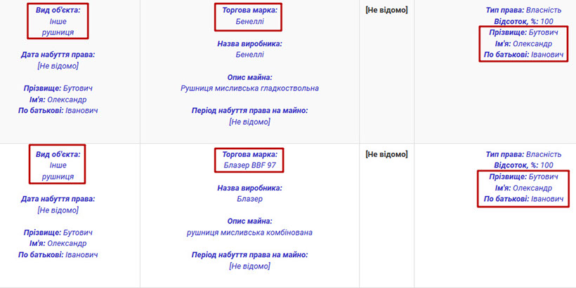 Окрім колекціонування землі, прокурор Олександр Бутович займається колекціонуванням зброї. У його власності 4 рушниці різних торгових марок: Бенеллі, Блазер BBF 97, Ремінгтон700 та Браунінг.