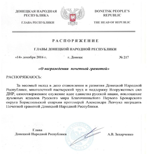 И уже совсем не удивительно при такой явной любви к «русскому миру» смотрится награждение Захарченком протоирея Бориспольской епархии Алексея Левчука почётной грамотой: «за весомый вклад в дело становления и развития Донецкой Народной Республики, поддержку Вооружённых сил ДНР, самоотверженное служение идее единства Русской нации…».